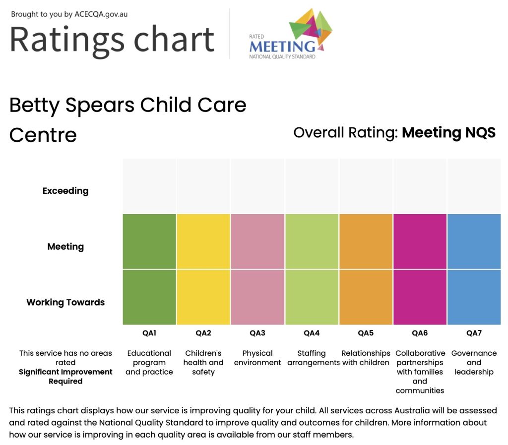 Please see here for a link to our NQF Ratings Chart at the ACECQA (Australian Children’s Education and Care Quality Authority’s) website. A full copy of our report can be emailed to you on request.